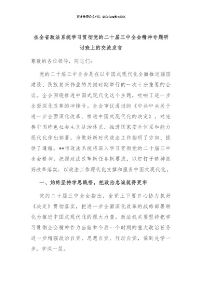 【七哥公文】2024年:在全省政法系统学习贯彻党的二十届三中全会精神专题研讨班上的交流发言 (1)+更多免费公文+VX:QiGeGongWen2024