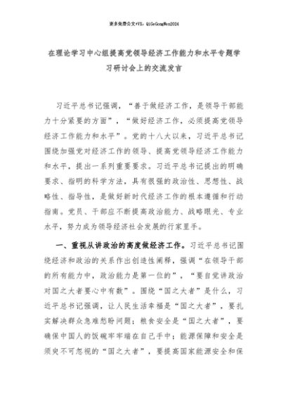 【七哥公文】2024年:在理论学习中心组提高党领导经济工作能力和水平专题学习研讨会上的交流发言+更多免费公文+VX:QiGeGongWen2024