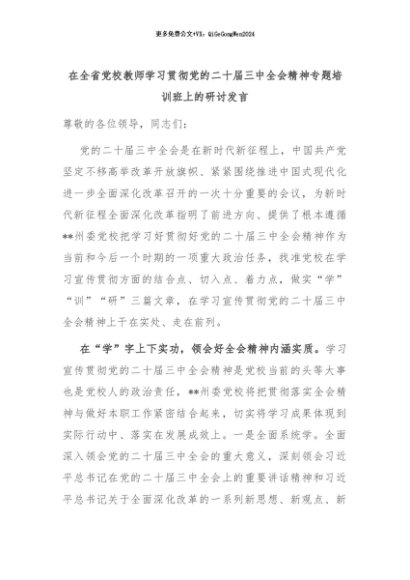 【七哥公文】2024年:在全省党校教师学习贯彻党的二十届三中全会精神专题培训班上的研讨发言 (1)+更多免费公文+VX:QiGeGongWen2024