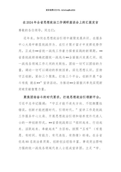 【七哥公文】2024年:在2024年全省思想政治工作调研座谈会上的汇报发言+更多免费公文+VX:QiGeGongWen2024