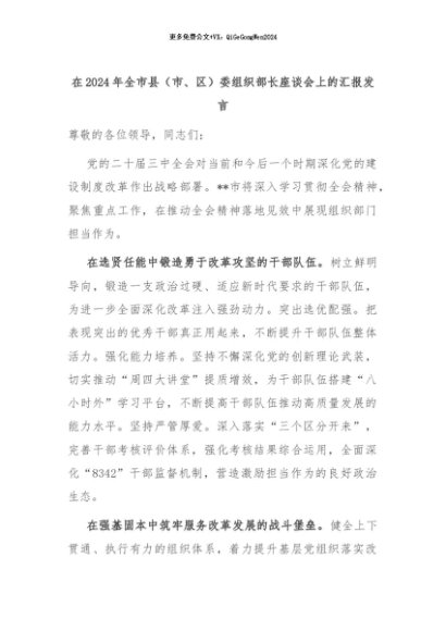 【七哥公文】2024年:在2024年全市县(市、区)委组织部长座谈会上的汇报发言+更多免费公文+VX:QiGeGongWen2024