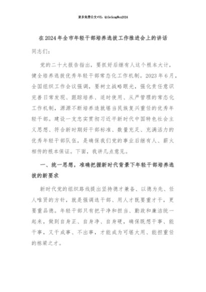 【七哥公文】2024年:在2024年全市年轻干部培养选拔工作推进会上的讲话+更多免费公文+VX:QiGeGongWen2024