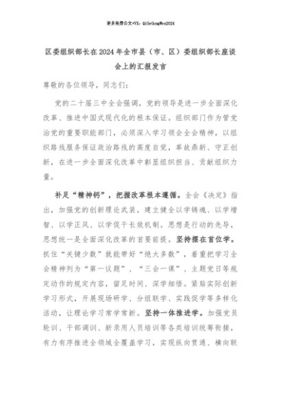 【七哥公文】2024年:区委组织部长在2024年全市县(市、区)委组织部长座谈会上的汇报发言+更多免费公文+VX:QiGeGongWen2024