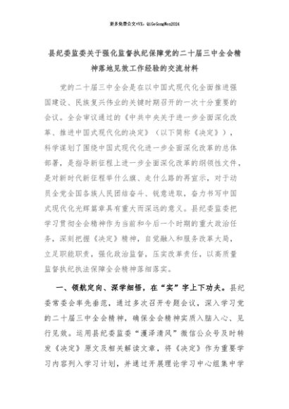 【七哥公文】2024年:县纪委监委关于强化监督执纪保障党的二十届三中全会精神落地见效工作经验的交流材料 (1)+更多免费公文+VX:QiGeGongWen2024