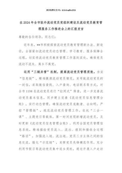 【七哥公文】2024年:在2024年全市驻外流动党员党组织建设及流动党员教育管理服务工作推进会上的汇报发言+更多免费公文+VX:QiGeGongWen2024