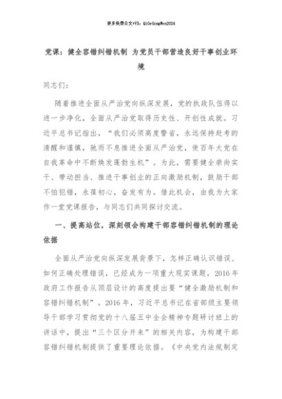 【七哥公文】2024年:党课:健全容错纠错机制 为党员干部营造良好干事创业环境+更多免费公文+VX:QiGeGongWen2024