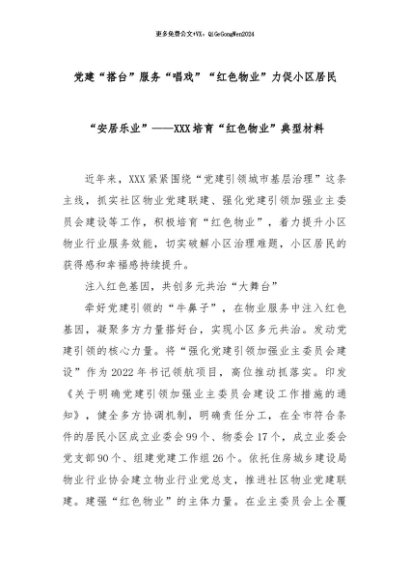 【七哥公文】2024年:党建“搭台”服务“唱戏”“红色物业”力促小区居民“安居乐业”——XXX培育“红色物业”典型材料+更多免费公文+VX:QiGeGongWen2024