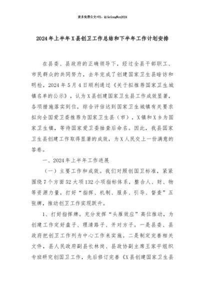 【七哥公文】2024年:2024年上半年X县创卫工作总结和下半年工作计划安排+更多免费公文+VX:QiGeGongWen2024