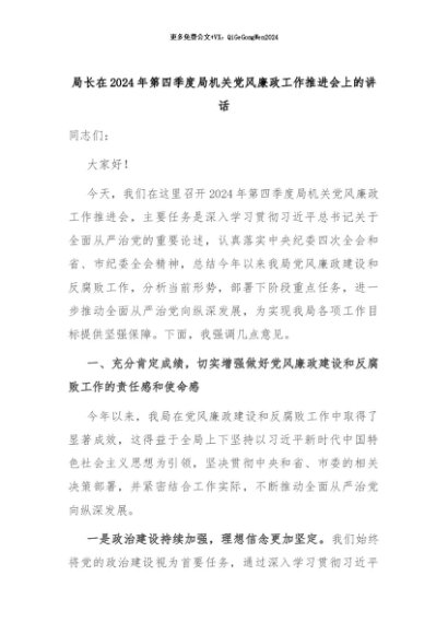 【七哥公文】2024年:局长在2024年第四季度局机关党风廉政工作推进会上的讲话+更多免费公文+VX:QiGeGongWen2024