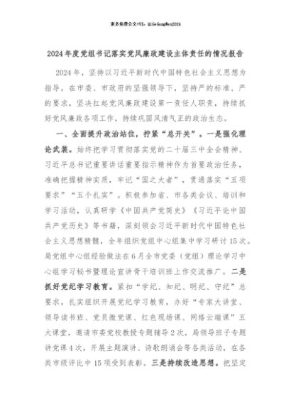 【七哥公文】2024年:2024年度党组书记落实党风廉政建设主体责任的情况报告+更多免费公文+VX:QiGeGongWen2024