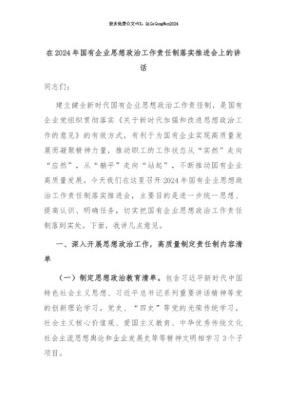 【七哥公文】2024年:在2024年国有企业思想政治工作责任制落实推进会上的讲话+更多免费公文+VX:QiGeGongWen2024