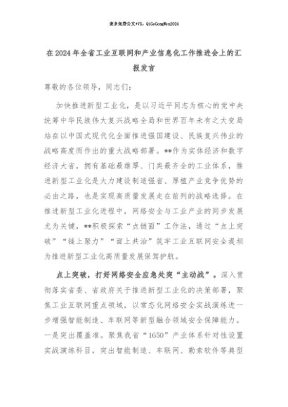 【七哥公文】2024年:在2024年全省工业互联网和产业信息化工作推进会上的汇报发言+更多免费公文+VX:QiGeGongWen2024