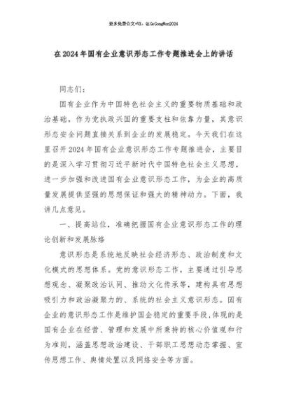 【七哥公文】2024年:在2024年国有企业意识形态工作专题推进会上的讲话 (1)+更多免费公文+VX:QiGeGongWen2024