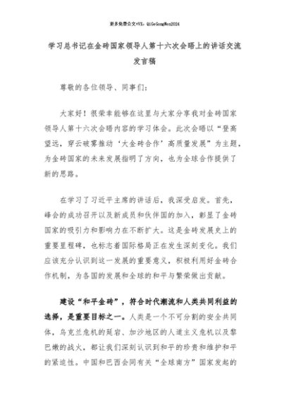【七哥公文】2024年:学习总书记在金砖国家领导人第十六次会晤上的讲话交流发言稿+更多免费公文+VX:QiGeGongWen2024