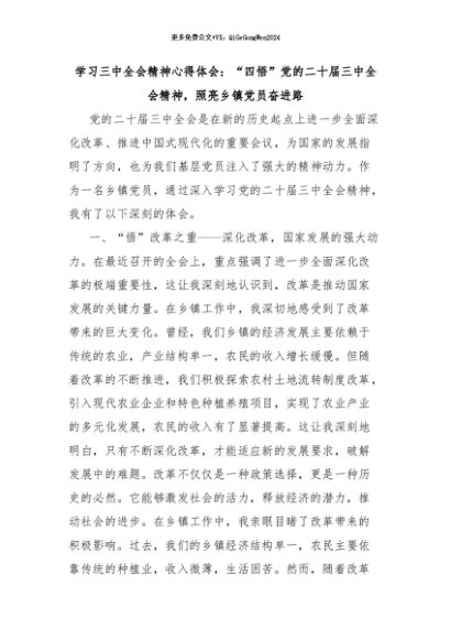 【七哥公文】2024年:学习三中全会精神心得体会:“四悟”党的二十届三中全会精神,照亮乡镇党员奋进路 (1)+更多免费公文+VX:QiGeGongWen2024