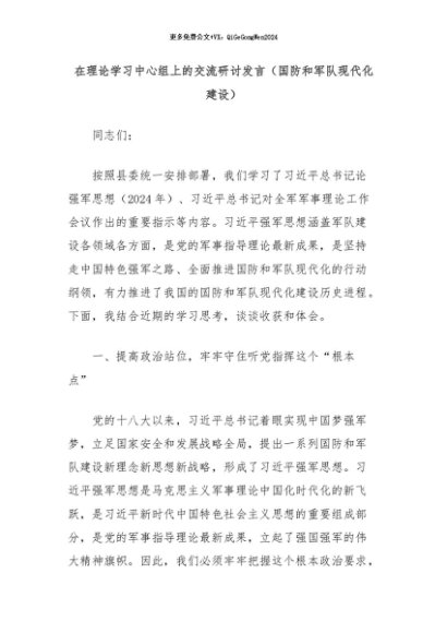【七哥公文】2024年:在理论学习中心组上的交流研讨发言(国防和军队现代化建设)+更多免费公文+VX:QiGeGongWen2024