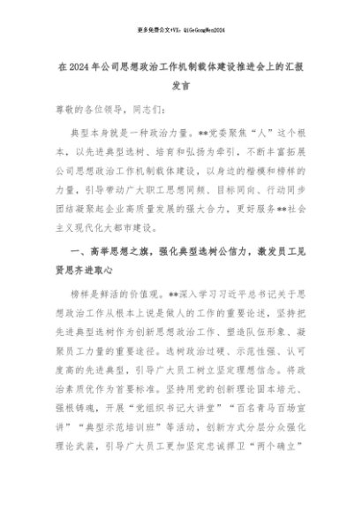 【七哥公文】2024年:在2024年公司思想政治工作机制载体建设推进会上的汇报发言+更多免费公文+VX:QiGeGongWen2024