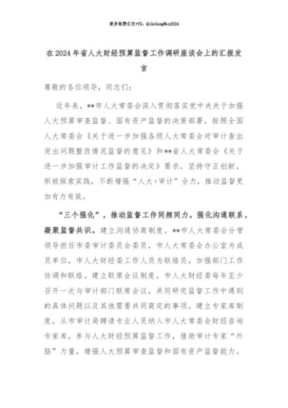 【七哥公文】2024年:在2024年省人大财经预算监督工作调研座谈会上的汇报发言+更多免费公文+VX:QiGeGongWen2024