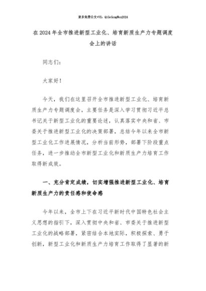 【七哥公文】2024年:在2024年全市推进新型工业化、培育新质生产力专题调度会上的讲话+更多免费公文+VX:QiGeGongWen2024