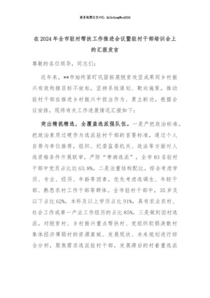 【七哥公文】2024年:在2024年全市驻村帮扶工作推进会议暨驻村干部培训会上的汇报发言+更多免费公文+VX:QiGeGongWen2024