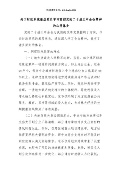 【七哥公文】2024年:关于财政系统基层党员学习贯彻党的二十届三中全会精神的心得体会 (1)+更多免费公文+VX:QiGeGongWen2024