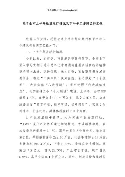 / 【七哥公文】2024年:关于全市上半年经济运行情况及下半年工作建议的汇报+更多免费公文+VX:QiGeGongWen2024