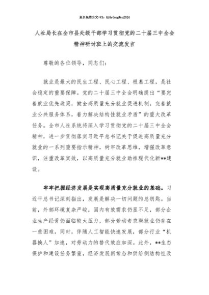 【七哥公文】2024年:人社局长在全市县处级干部学习贯彻党的二十届三中全会精神研讨班上的交流发言 (1)+更多免费公文+VX:QiGeGongWen2024