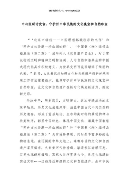 【七哥公文】2024年:中心组研讨发言:守护好中华民族的文化瑰宝和自然珍宝+更多免费公文+VX:QiGeGongWen2024