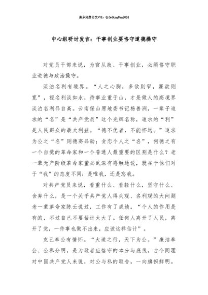 / 【七哥公文】2024年:中心组研讨发言:干事创业要恪守道德操守+更多免费公文+VX:QiGeGongWen2024