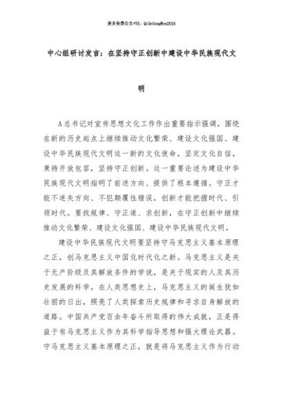 【七哥公文】2024年:中心组研讨发言:在坚持守正创新中建设中华民族现代文明+更多免费公文+VX:QiGeGongWen2024