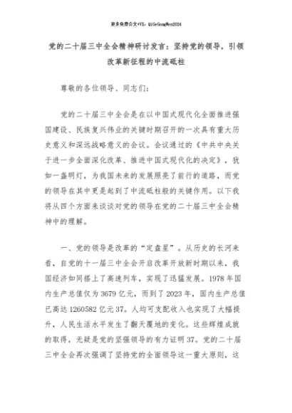 【七哥公文】2024年:党的二十届三中全会精神研讨发言:坚持党的领导,引领改革新征程的中流砥柱 (1)+更多免费公文+VX:QiGeGongWen2024