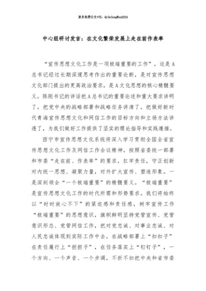 / 【七哥公文】2024年:中心组研讨发言:在文化繁荣发展上走在前作表率+更多免费公文+VX:QiGeGongWen2024