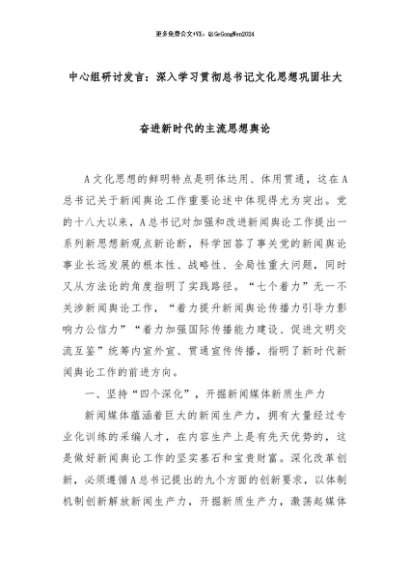 【七哥公文】2024年:中心组研讨发言:深入学习贯彻总书记文化思想巩固壮大奋进新时代的主流思想舆论+更多免费公文+VX:QiGeGongWen2024