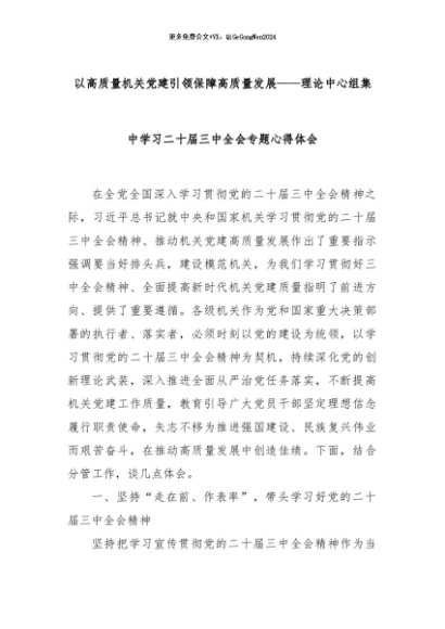 【七哥公文】2024年:以高质量机关党建引领保障高质量发展——理论中心组集中学习二十届三中全会专题心得体会 (1)+更多免费公文+VX:QiGeGongWen2024
