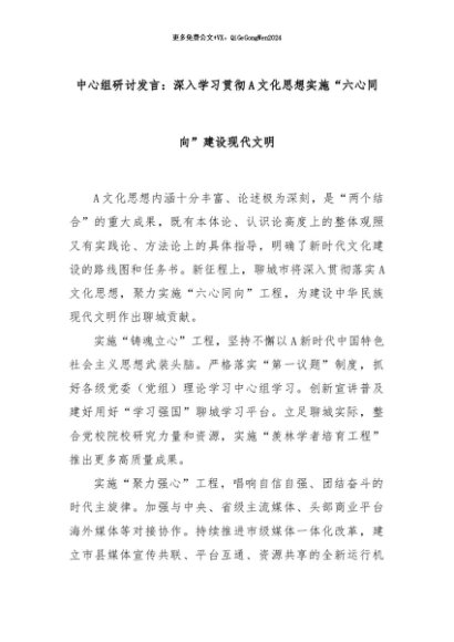 【七哥公文】2024年:中心组研讨发言:深入学习贯彻A文化思想实施“六心同向”建设现代文明+更多免费公文+VX:QiGeGongWen2024