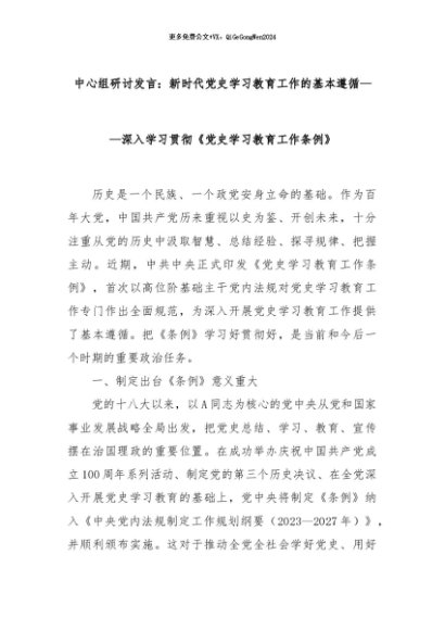 【七哥公文】2024年:中心组研讨发言:新时代党史学习教育工作的基本遵循——深入学习贯彻《党史学习教育工作条例》+更多免费公文+VX:QiGeGongWen2024