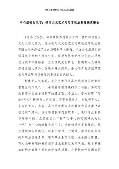 【七哥公文】2024年:中心组研讨发言:推动文化艺术与思想政治教育深度融合+更多免费公文+VX:QiGeGongWen2024