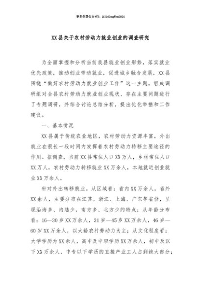 【七哥公文】2024年:XX县关于农村劳动力就业创业的调查研究+更多免费公文+VX:QiGeGongWen2024