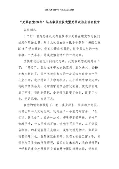【七哥公文】2024年:“光荣在党50年”纪念章颁发仪式暨党员政治生日会发言 (1)+更多免费公文+VX:QiGeGongWen2024