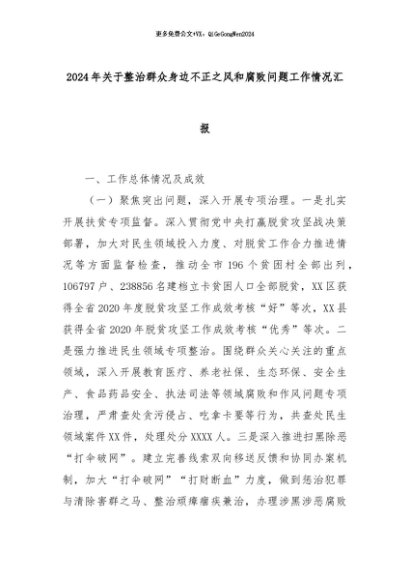 【七哥公文】2024年:2024年关于整治群众身边不正之风和腐败问题工作情况汇报+更多免费公文+VX:QiGeGongWen2024