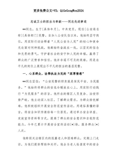 【七哥公文】2025年:忠诚卫士的担当与奉献——同志先进事迹+更多免费公文+VX:QiGeGongWen2024+更多免费公文+VX:QiGeGongWen2024