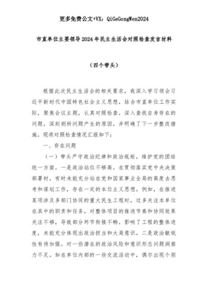 【七哥公文】2025年:市直单位主要领导2024年民主生活会对照检查发言材料(四个带头)+更多免费公文+VX:QiGeGongWen2024+更多免费公文+VX:QiGeGongWen2024