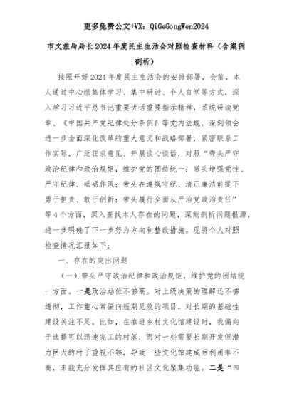 【七哥公文】2025年:市文旅局局长2024年度民主生活会对照检查材料(含案例剖析)+更多免费公文+VX:QiGeGongWen2024+更多免费公文+VX:QiGeGongWen2024