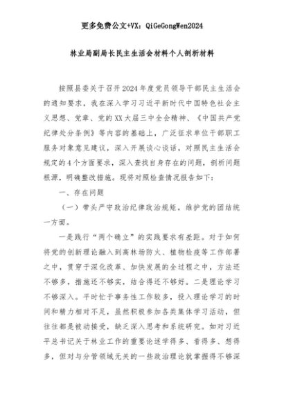 【七哥公文】2025年:林业局副局长民主生活会材料个人剖析材料+更多免费公文+VX:QiGeGongWen2024+更多免费公文+VX:QiGeGongWen2024