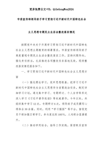 【七哥公文】2025年:市委宣传部领导班子学习贯彻习近平新时代中国特色社会主义思想专题民主生活会整改落实情况+更多免费公文+VX:QiGeGongWen2024+更多免费公文+VX:QiGeGongWen2024
