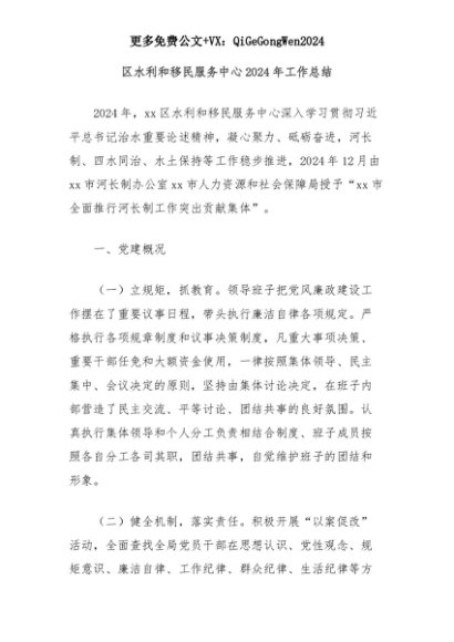 【七哥公文】2025年:区水利和移民服务中心2024年工作总结+更多免费公文+VX:QiGeGongWen2024+更多免费公文+VX:QiGeGongWen2024