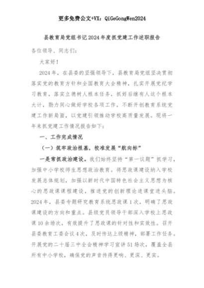 【七哥公文】2025年:县教育局党组书记2024年度抓党建工作述职报告+更多免费公文+VX:QiGeGongWen2024+更多免费公文+VX:QiGeGongWen2024