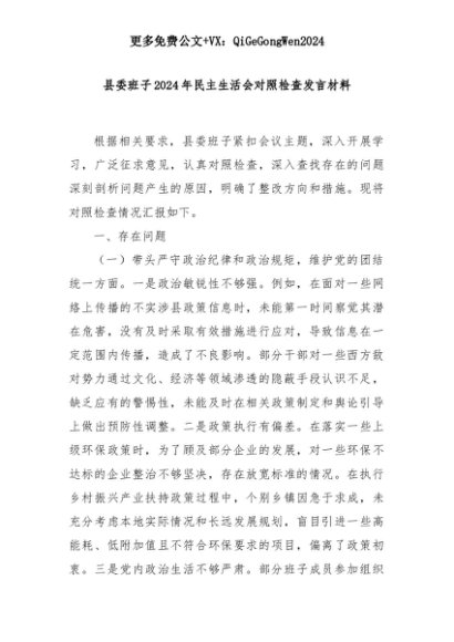 【七哥公文】2025年:县委班子2024年民主生活会对照检查发言材料+更多免费公文+VX:QiGeGongWen2024+更多免费公文+VX:QiGeGongWen2024