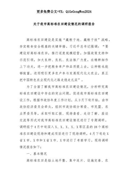 【七哥公文】2025年:关于我市高标准农田建设情况的调研报告+更多免费公文+VX:QiGeGongWen2024+更多免费公文+VX:QiGeGongWen2024