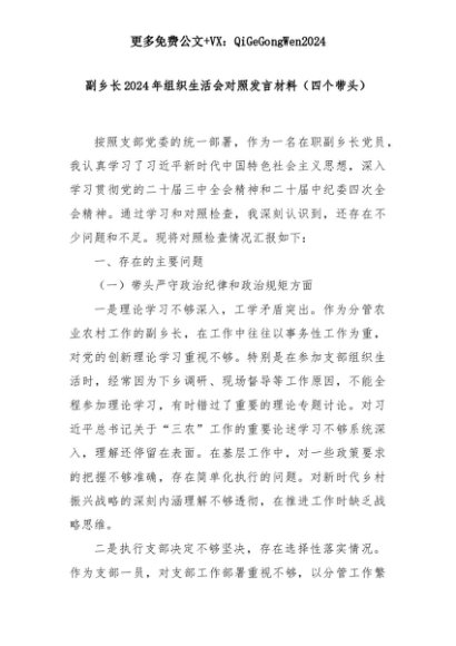 【七哥公文】2025年:副乡长2024年组织生活会对照发言材料(四个带头)+更多免费公文+VX:QiGeGongWen2024+更多免费公文+VX:QiGeGongWen2024